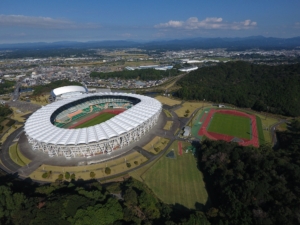 袋井市と掛川市にまたがる小笠山北西麓にひろがる、広さ269haの小笠山総合運動公園。