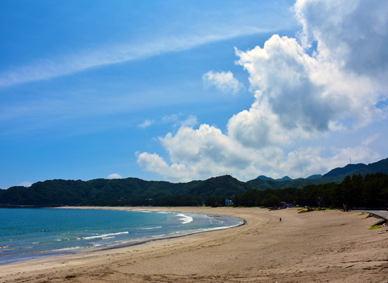 波が穏やかで遠浅なビーチが、家族連れや子どもも楽しめると人気の海水浴場。美しい海を身近に感じる磯観察やシュノーケリング、シーカヤック、ダイビングなど、さまざまなアクティビティが体験できます。日本の渚百選にも選定されています。